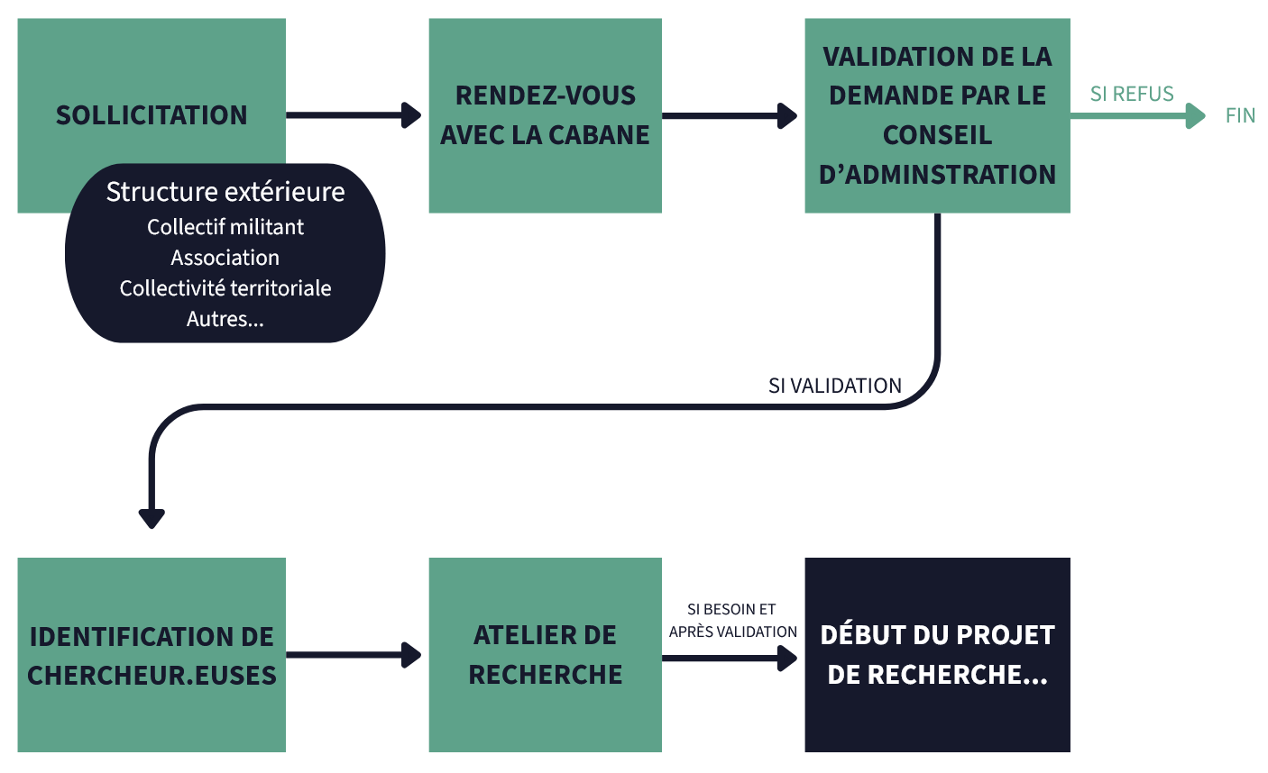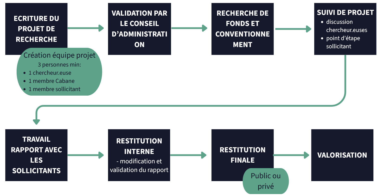 Suite à un atelier de recherche, nous pouvons également proposer l’accompagnement à un projet de recherche, porté conjointement par la structure sollicitante et la Cabane de la recherche.