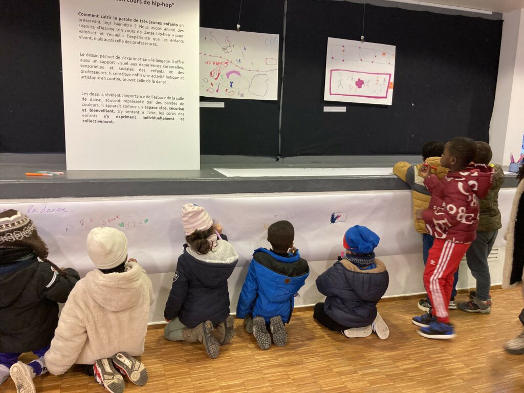 Le vernissage était à l’image de ce projet : un beau moment de partage, rassemblant des personnes du monde de la recherche, des institutions publiques et des équipements culturels, de la danse et de l’animation… et des enfants du centre de loisir Anne Franck à Villetaneuse que nous remercions de tout coeur pour avoir permis cette rencontre !